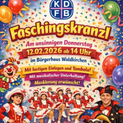 Am unsinnigen Donnerstag lädt der KDFB zum Faschingskranzl ein. Mit lustigen Einlagen und Tombola , musikalischer Unterhaltung und Auftritt der Kinder-& Jugendgarde Waldkirchen. Maskierung erwünscht !